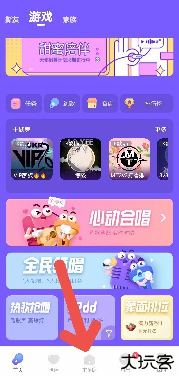 1、启动撕歌 App,默认进入的就是主题房页面,从这里开始
