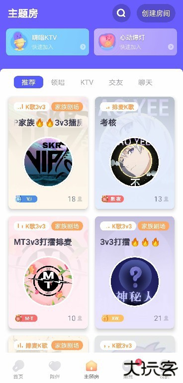 2、 主题房:大家聚在连麦空间里,好多有趣的主题房可以选!想唱歌排队上麦、玩记歌词挑战、试着认识新朋友、或者来场小游戏对决…… 玩法可多了,就看你喜欢哪种!