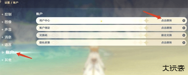 2、在设置菜单里点 “账户”,再点里面的 “用户中心”,找到 “点击跳转” 这个按钮按下去