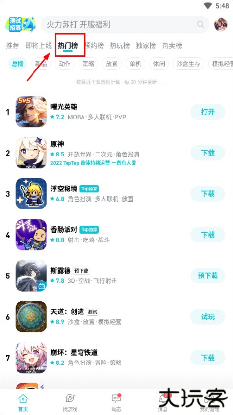 1、把 TapTap 最新版 2025 打开,直接戳一下热门榜,在里面挑个自己喜欢的游戏,像《原神》这种
