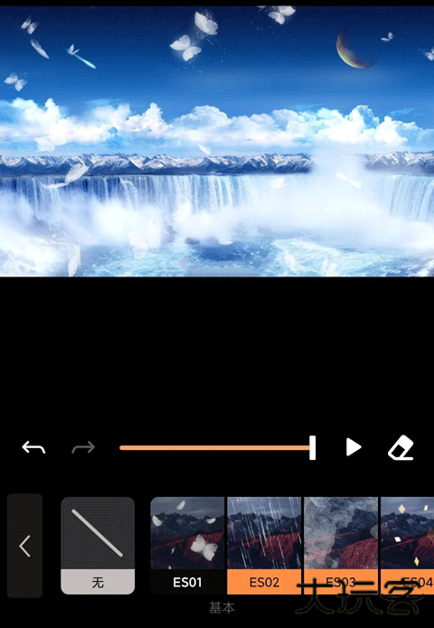 6、切换下方工具栏最右侧的魔棒状【特效菜单】,推荐选排在前列的【ES09】特效,画面会添加蝴蝶飞舞效果。其他特效也能尝试,做完点顶栏右角的导出箭头