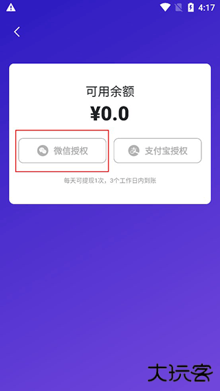 5、提现流程开始后,界面通常会引导你选择提现方式。这时需要开通 / 授权微信提现(或类似描述,例如 “绑定微信”),按照提示点击确认开通,允许 app 向微信申请提现就行啦