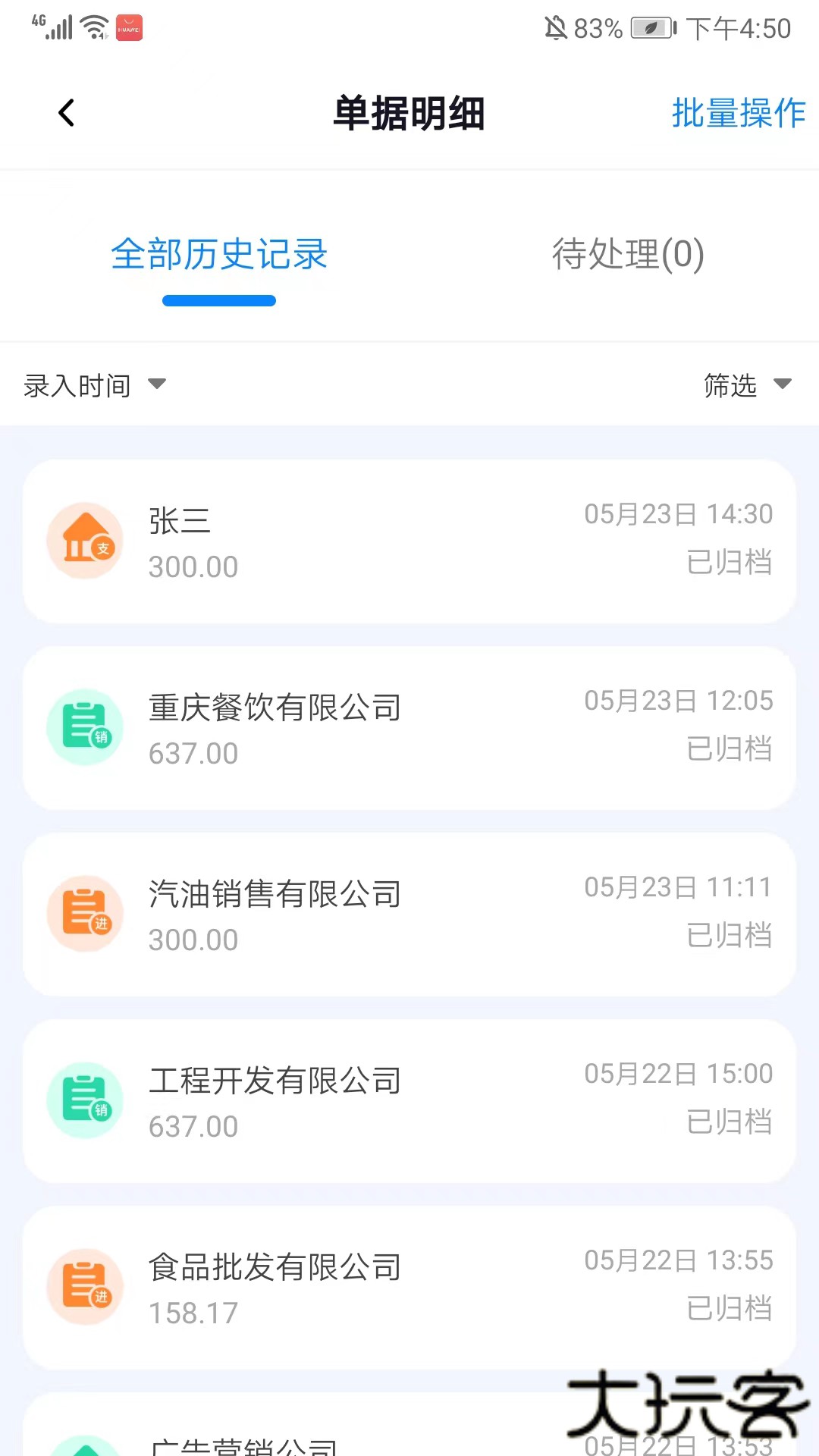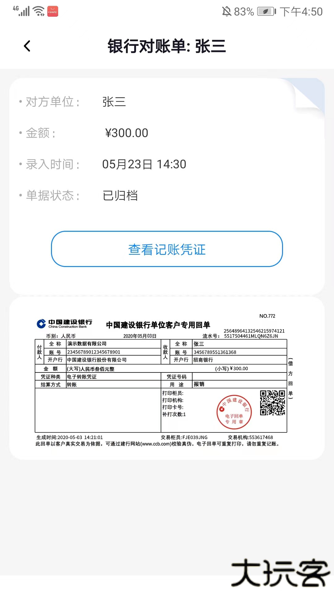 3、点开任何一条单据记录,就能看到交易的完整信息了:涉及哪个公司、多少钱、什么时候记的、当前状态(比如待审核 / 已完成),还有对应的记账凭证图片或信息