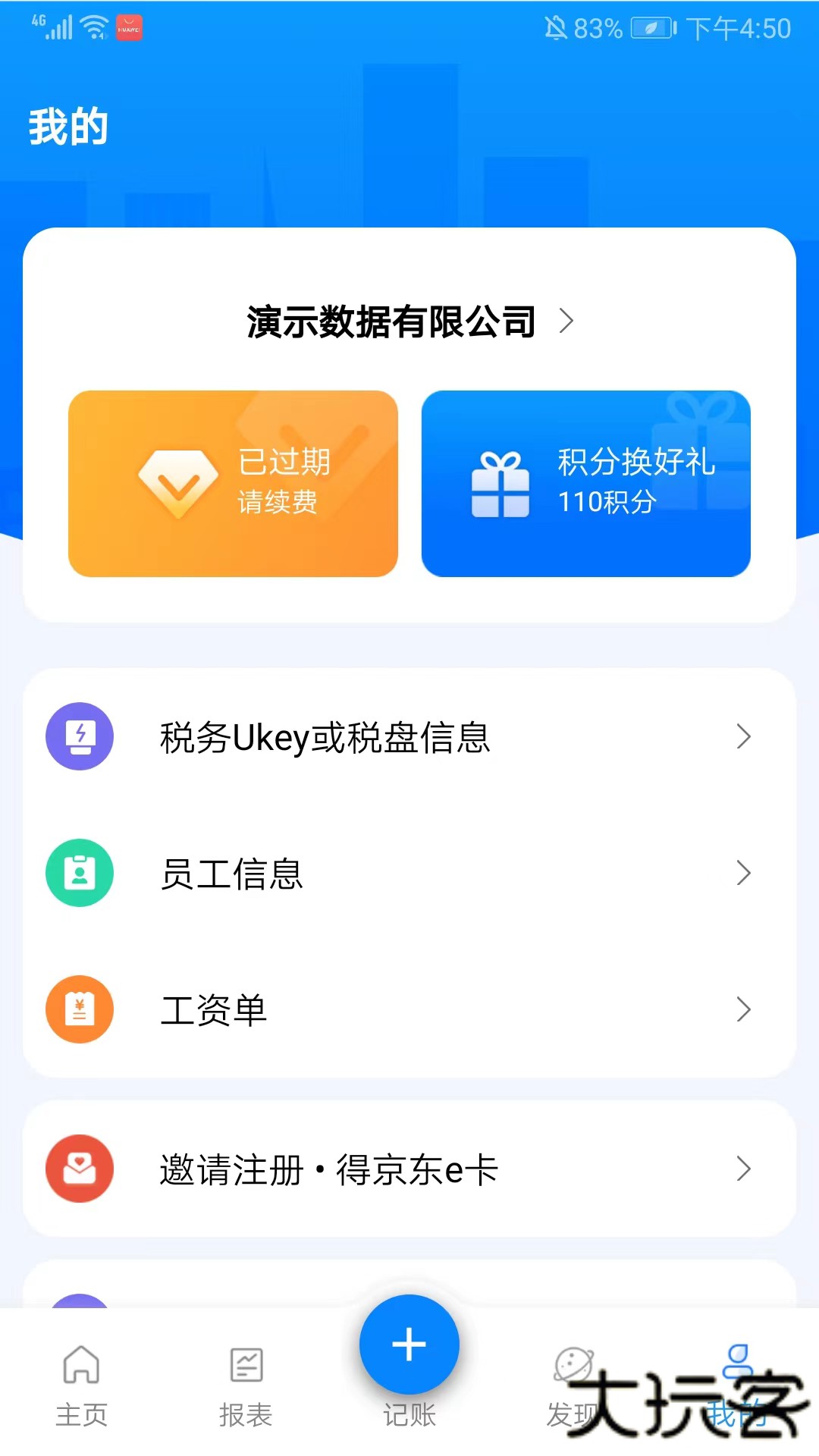 7、自己的账户配置都在【我的】页搞定:报税要用的税务 Ukey 或金税盘资料在这维护,员工花名册管理、工资条查看和发放也在这块处理