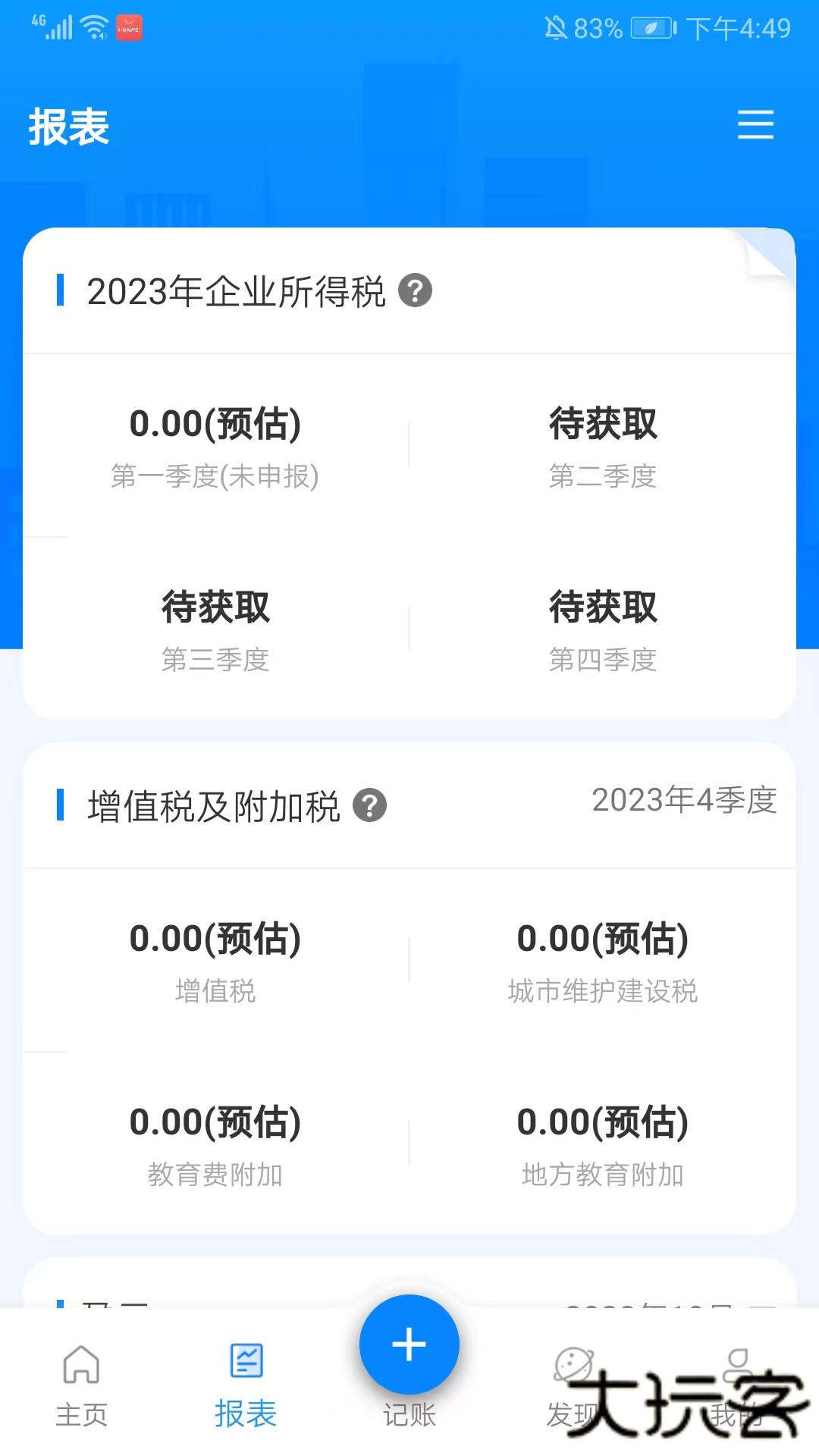 4、切换到【报表】栏目下,重点关注不同季度的税务情况展示,像你每个季度要预缴的企业所得税、增值税,还有附加税费等,都能分门别类地查看数据