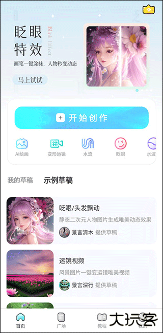 2、一进入首页就能看到好多热门的特效,想开始做图的话,点那个 “开始创作” 按钮