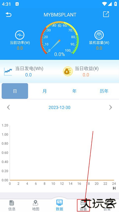 2、系统切换至该电站的详情页面,用户在此页面查找并点击右下角的 “设备” 功能按钮,进入电站关联的设备管理界面。