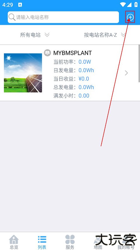 1、用户下载并打开软件,登录个人账号。在软件首页点击底部导航栏的 “电站列表” 选项,进入列表页面后,点击页面右上角的 “+” 符号按钮。