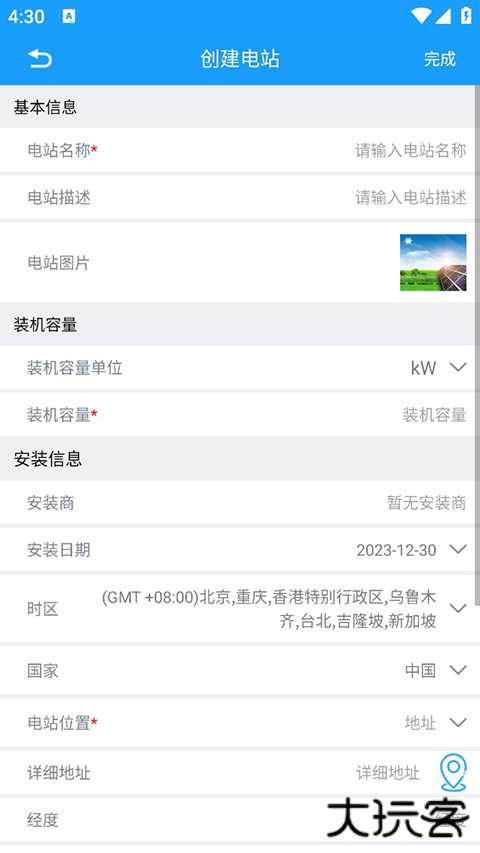 2、进入电站信息录入页面,用户需根据要求准确填写目标电站的各项信息参数。填写完毕后,点击页面左上角的 “完成” 按钮提交信息。