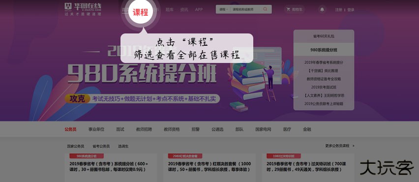 1、用户登录华图在线网站后,在首页的 “全部课程分类” 区域,按照课程类别筛选并定位所需课程。