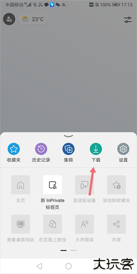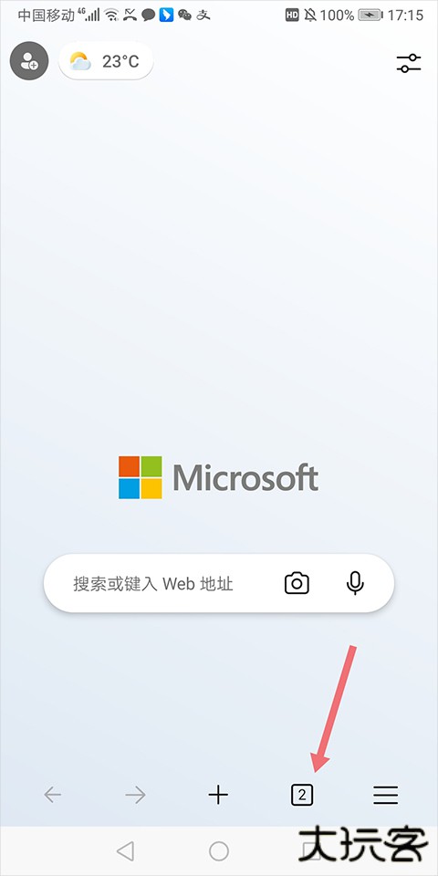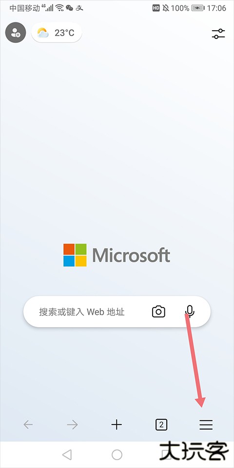 1、打开微软浏览器手机版,在主页右下角找到功能菜单图标(三条横线或三个点)。