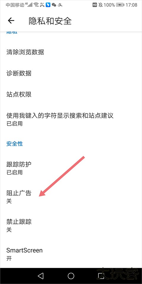4、在隐私与安全设置里,选择【阻止广告】。