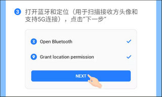 3、打开蓝牙和定位(用于扫描接收方头像和支持5G连接),点击“下—步”