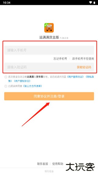 1、下载并安装运满满货主版应用程序,完成初始化后选择账号登录入口。输入个人手机号码及系统发送的短信验证码,勾选用户协议并点击【同意协议并注册 / 登录】按钮。新用户首次登录将自动完成账号注册流程。