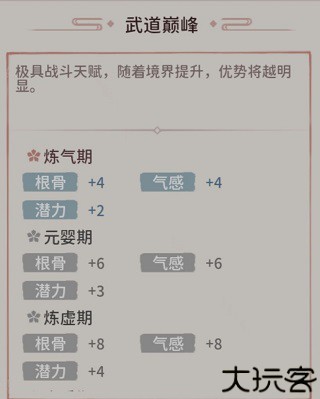 而成长型属性则会随着境界提升会为角色附加更多的属性,如图: