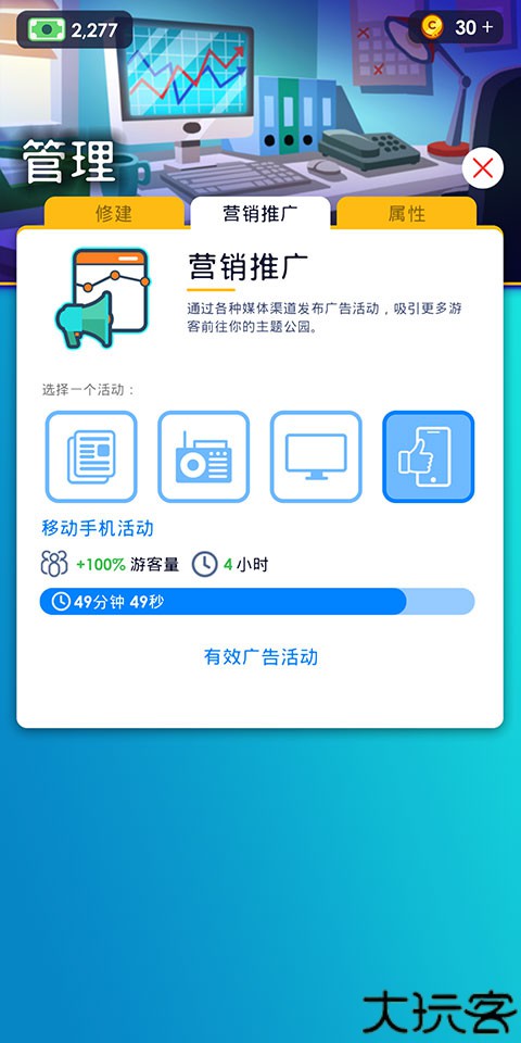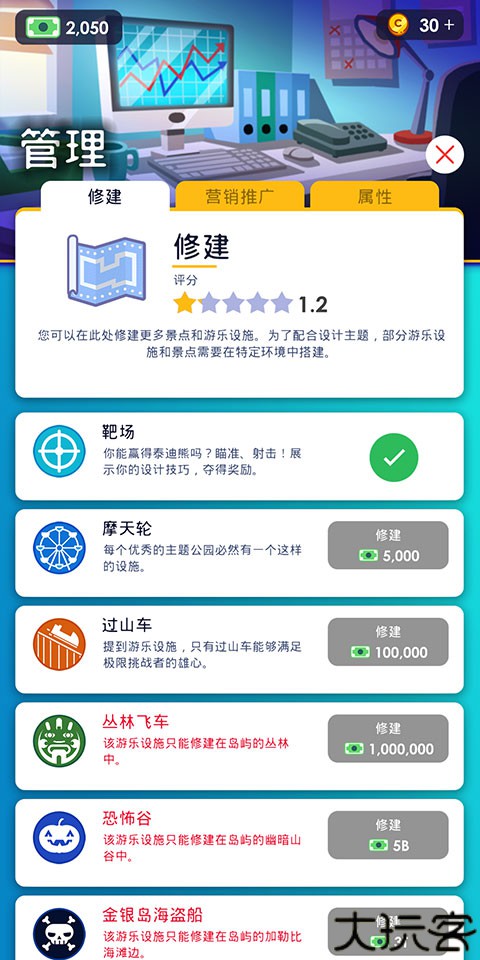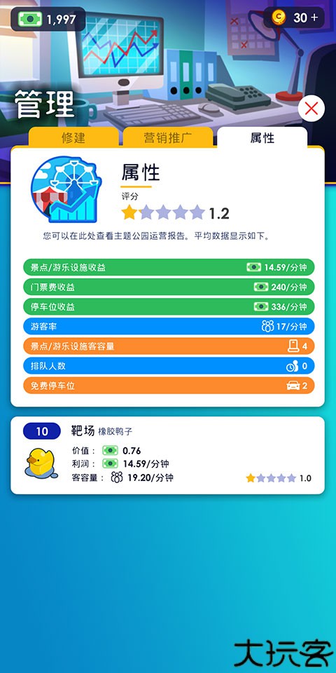 打开管理功能下的属性界面,就可以很直观看到闲置主题公园的各项基本数据了,然后再对短板进行针对性补强就可以了。