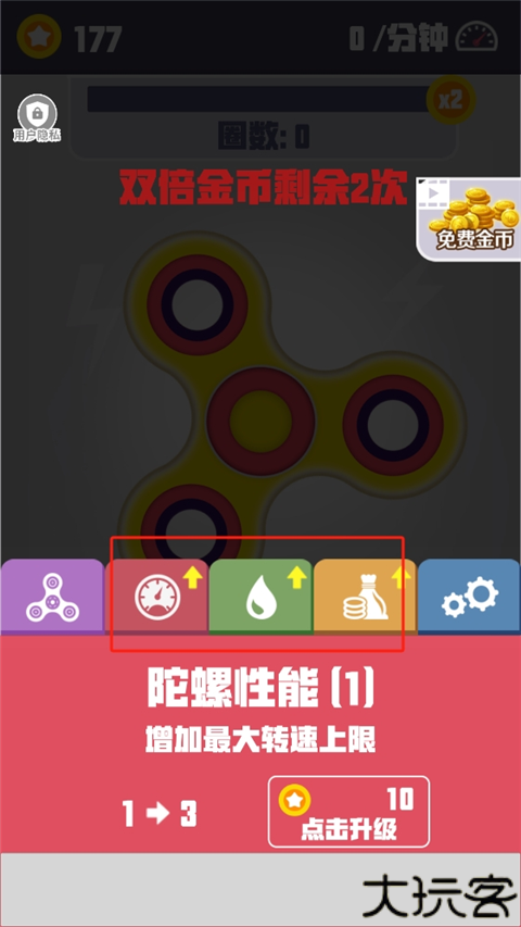 3、玩家也可以用金币升级陀螺,提升指尖陀螺的性能、润滑度等数值,让它旋转地更加持久。
