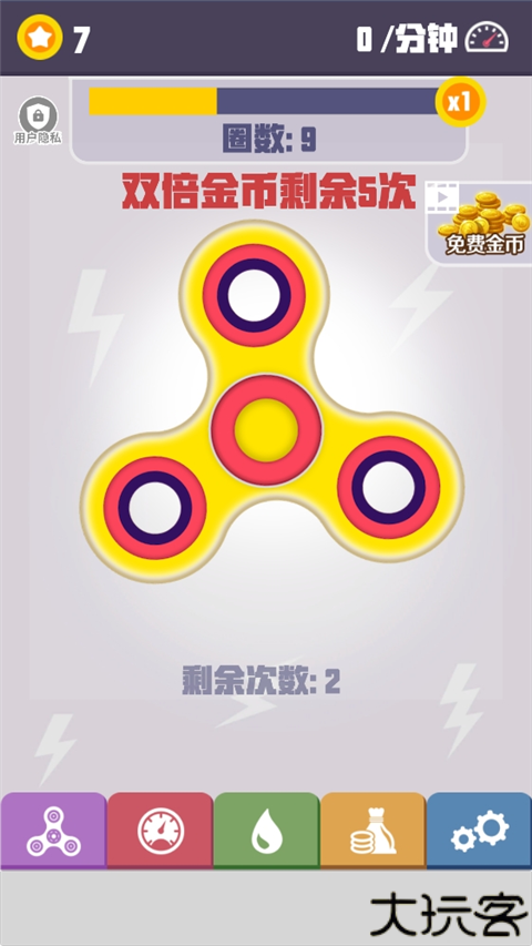 2、当玩家达成上方的圈数要求即可获得金币,点击右下角的陀螺图标即可解锁更多的指尖陀螺样式。