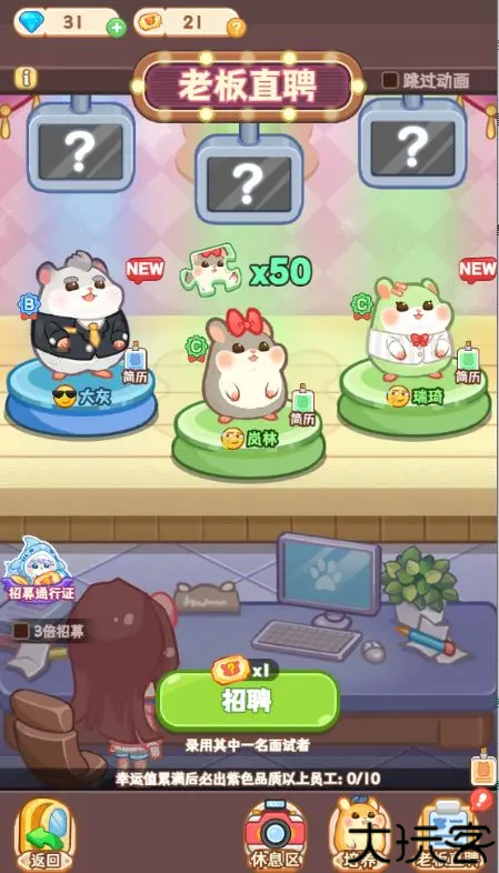 2、点击员工可前往招聘界面,自由挑选仓鼠入职,为各类岗位安排合适人选。