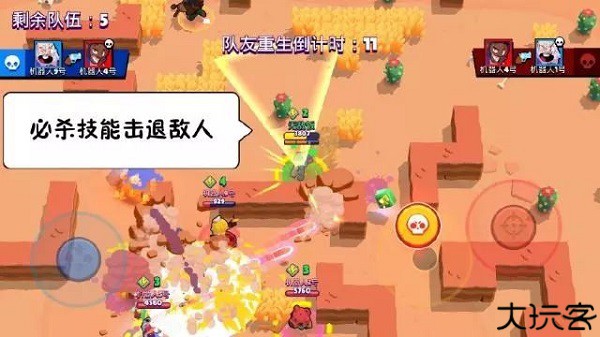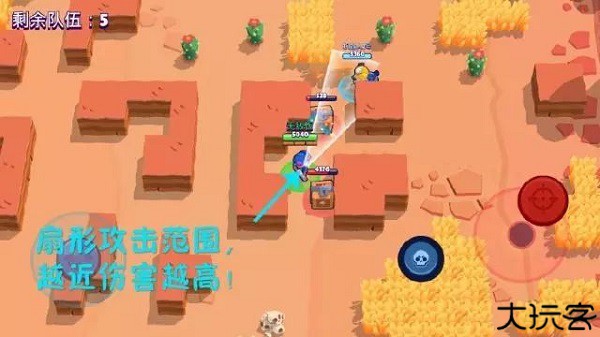 其次除了普攻,雪莉的超级技能可以理解为普攻的升级版,射程更远,伤害更高,近距离有斩杀效果。雪莉的超级技能贴身打到半血的公牛身上,也能瞬间秒杀。同时必杀技有击退效果,如果你解锁了星徽之力,还会在2.5秒内持续减速敌人。另外,必杀技能击破掩体,用来对付那些躲在石头后的残血敌人。