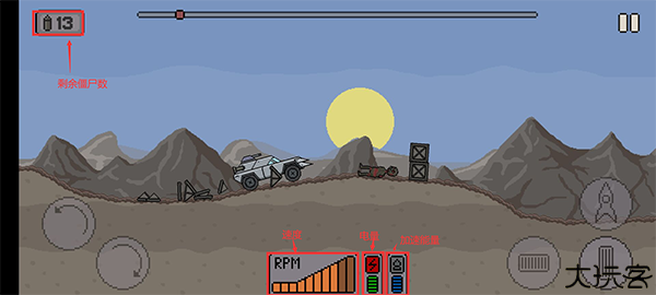 7、中间下方是赛车的能量和速度等,而左上角是僵尸人数,玩家需要开始行驶。