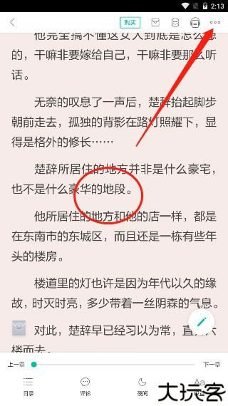1、进入阅读界面,点击中心点,才会进入菜单模式,点击三点图标。