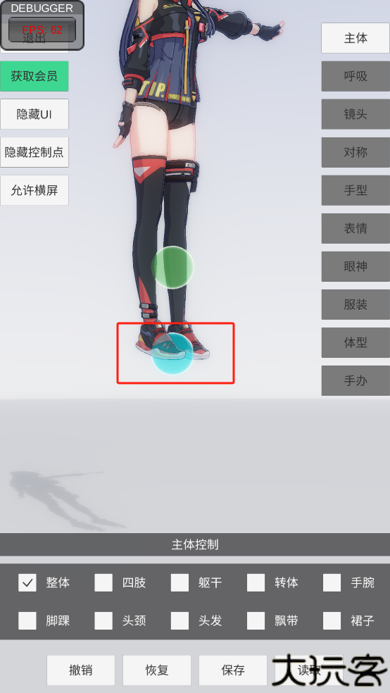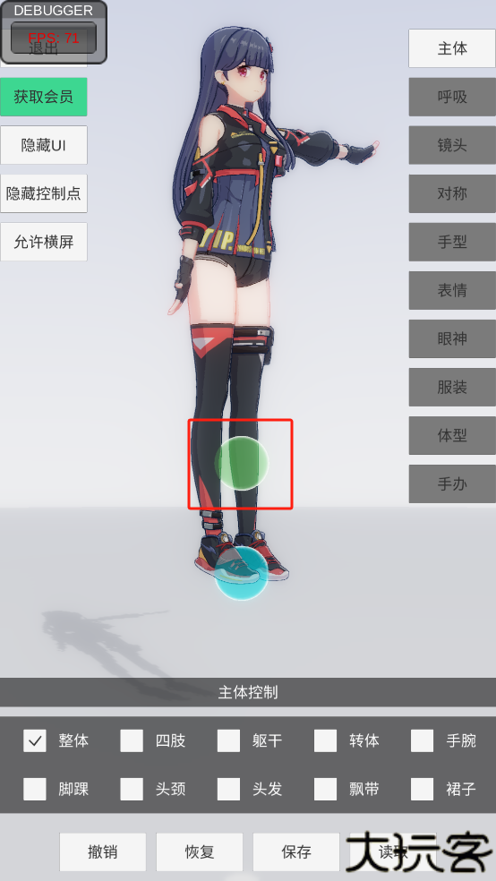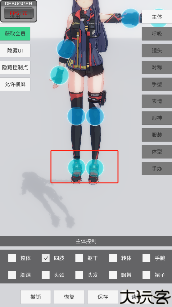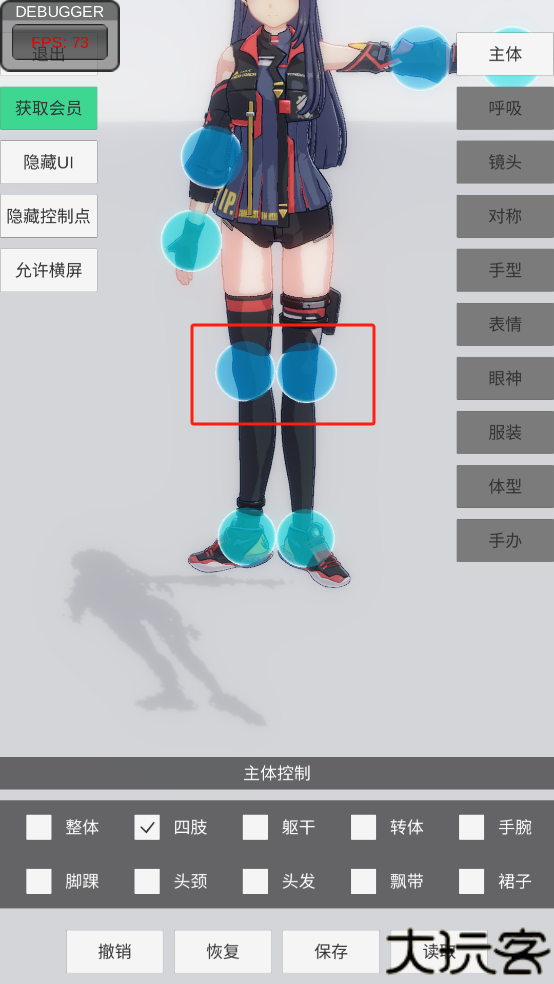 3、点击四肢,青蓝色的球可以控制四肢的移动。