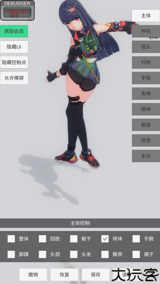 6、点按转体,可通过两个绿色的球控制上半身的转动程度。