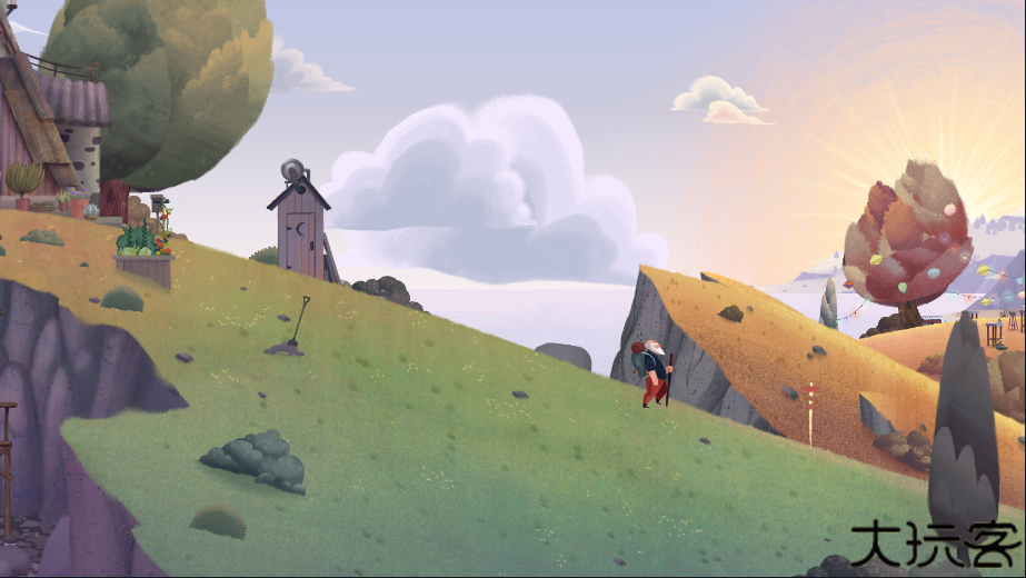 3、直接点击远方的房子,老人会自动寻路,让他跳过各个山谷,走到房子前的椅子上坐下。