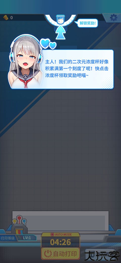 2、每打印完一行,就可以获得一定的二次元液体并存储到顶部的浓度杯中,浓度足够时还可以解锁额外奖励。