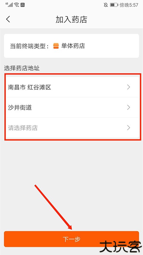 4、确认好药店的地址和药店的名称之后,选择下方的“下一步”。