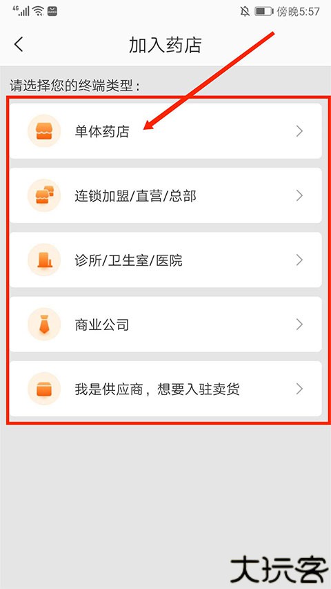 2、随后进入药店类型界面,选择相应的类型即可,这里会以“单体药店”为例。