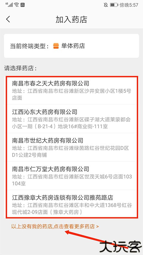 3、用户可在“加入药店”的列表中出现附近的药店名称进行查找或者选择下方“以上没有我的药店,点击查看更多药店”选项。