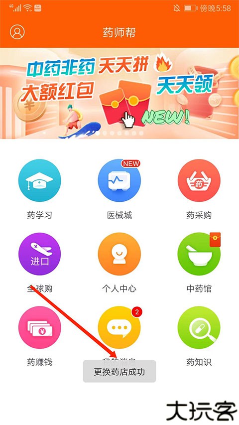 6、返回应用的主页面,可看到“更换药店成功”提示,就表示已成功加入药店了。