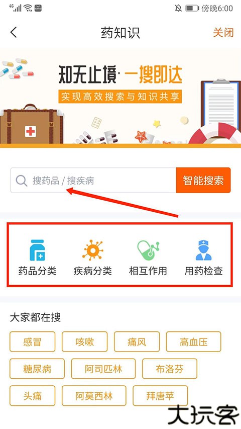 2、进入药知识界面后,用户可根据自己的需求选择“药品分类”、“疾病分类”、“相互作用”和“用药检查”查询。