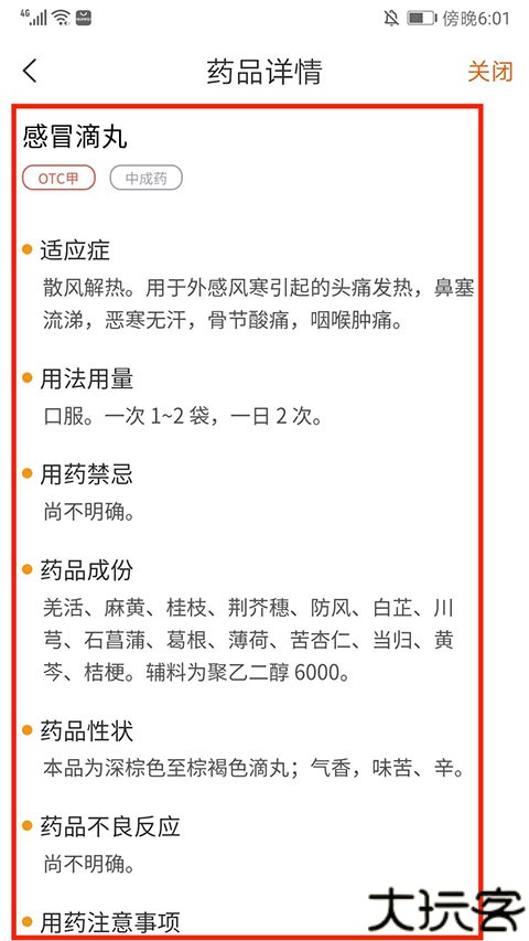 5、进入药品详情后,用户可看到屏幕上有“适应症”、“用法用量”、“用药禁忌”、“药品成份”、“药品性状”和“药品不良反应”等一系列内容。