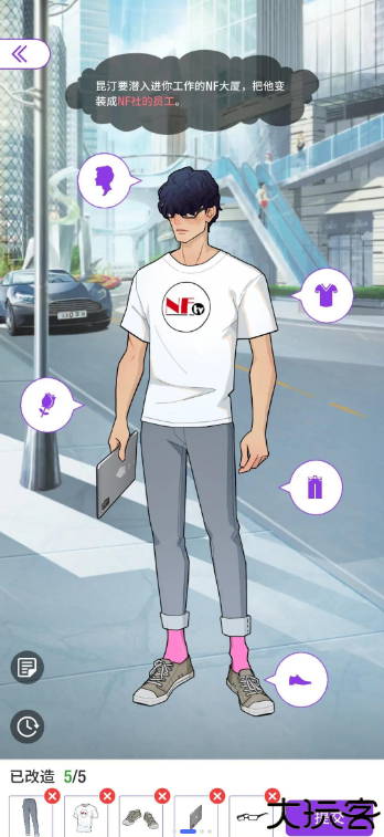 2、昆汀需要潜入NF大厦,变装成员工进行侦查。你需要为他提供所需的装备,让他顺利完成任务。