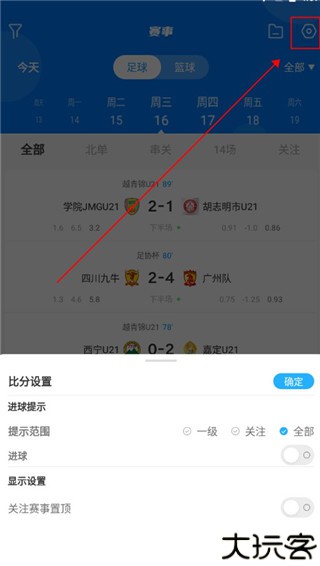 3、进入右上角设置,启用进球推送便捷掌握战局。