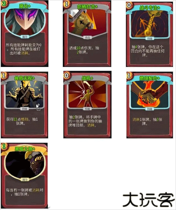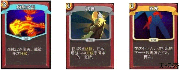 灼热攻击:前期选择好之后,尽可能选择篝火多的路线,这张卡可以无限强化。强化次数越多,攻击越高,是杀戮尖塔中单卡输出最高的牌。