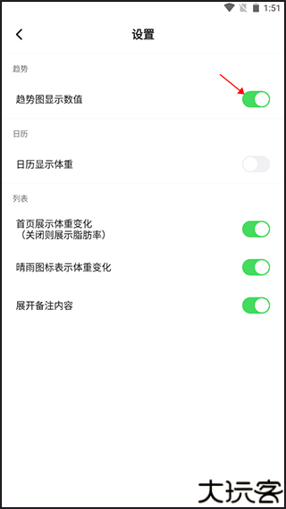 找到趋势相关按钮,将其开启至绿色状态即可完成显示数值设定。