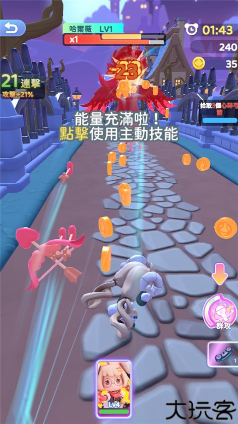 在主线地图中奔跑闯关,收集金币能量释放技能击退阻挡敌人。
