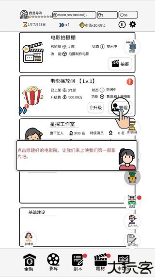 9、等到电影拍摄完成后,点击修建好的电影院,开始着手上映第一部由玩家导的电影吧。