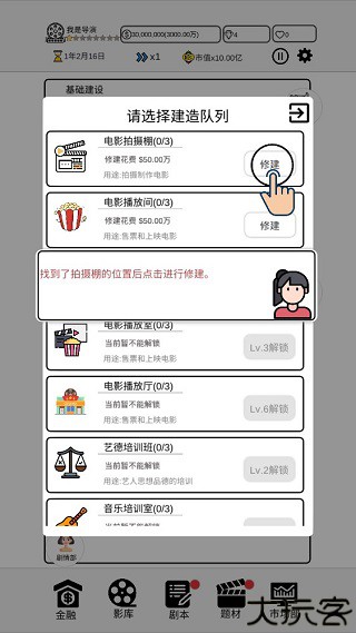 3、首先,玩家需要来手动修建一间电影摄影棚,用来后续的电影拍摄工作,具体操作如图所示