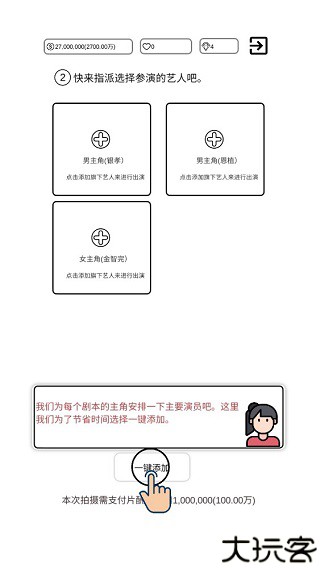 8、影片名称确定好之后,接着就是为剧本的主角分配艺人,为了节省时间,玩家可透过一键添加进行设置。