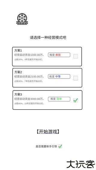 1、进入游戏,选择存档,之后选择一种经营模式,如方案1:经营启动资金1000.00万,占股20%,4年后股东开始分红;方案2:经营启动资金2100.00万,占股30%,7年后股东开始分红;方案3…,不一样的选择方案对应的难度不同,如果是新人导演,建议从简单的方案3开始做起。