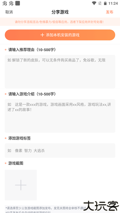 3、在这里填写相关信息,如推荐理由、游戏介绍、游戏标签、游戏截图。