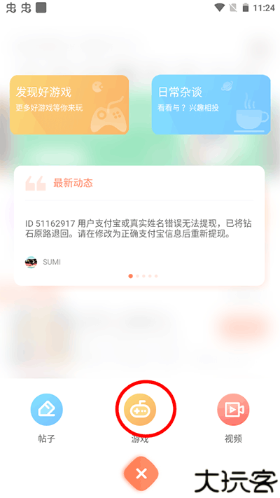 2、在这个+号功能里,有着发布帖子、游戏、视频功能,点击游戏选项。