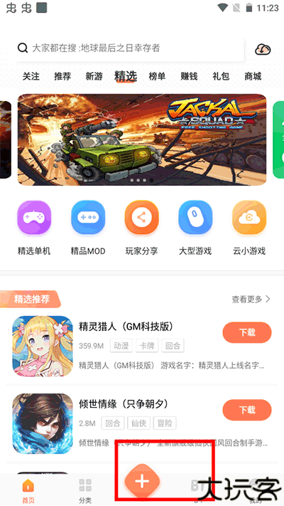 1、安装好软件后进入,可以浏览众多游戏,也能进行分享,点击下方+号。