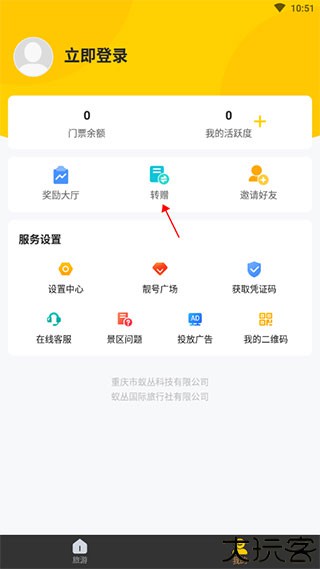 1、首先打开打开蚁丛旅游,在“我的”页面上点击“转赠”。