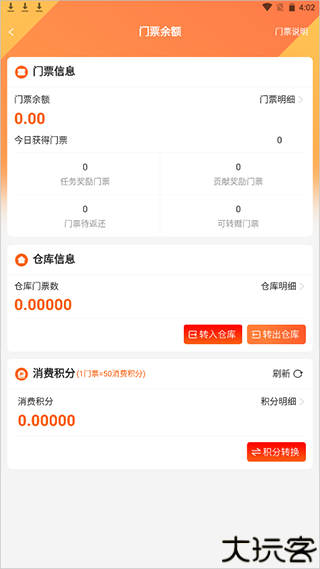 2、用户进入后,在仓库门票转赠中点击“转入仓库”,然后输入要转换的数量和密码。